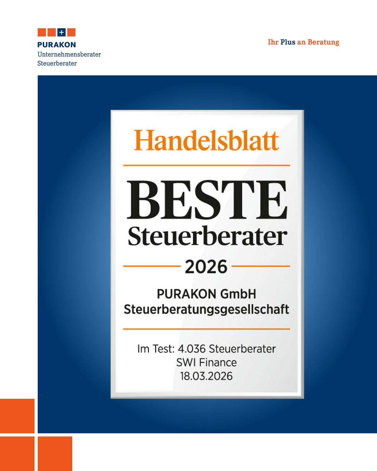Die PURAKON Steuerberatung wurde vom Handelsblatt als „Beste Steuerberater 2026“ ausgezeichnet.